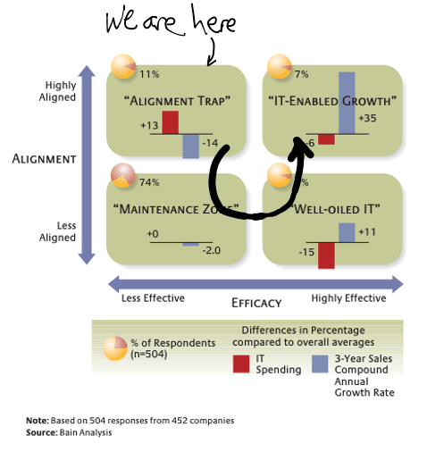 So, how does a company get out of such a predicament? Bain’s escape path is a pendulum swing away from tight alignment between IT and the business.