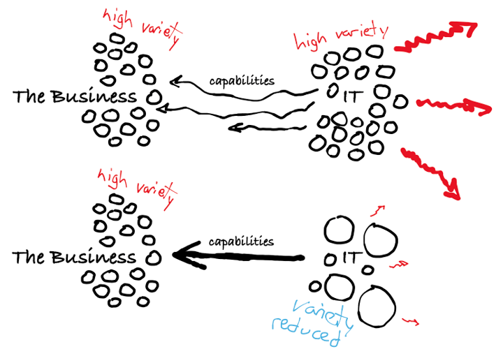 The business is not wrong for wanting those million things. IT is not wrong for wanting to meet the requests. But IT will implode (and the business with it) if it does not find a way to significantly reduce the variety across things it must build and maintain.
